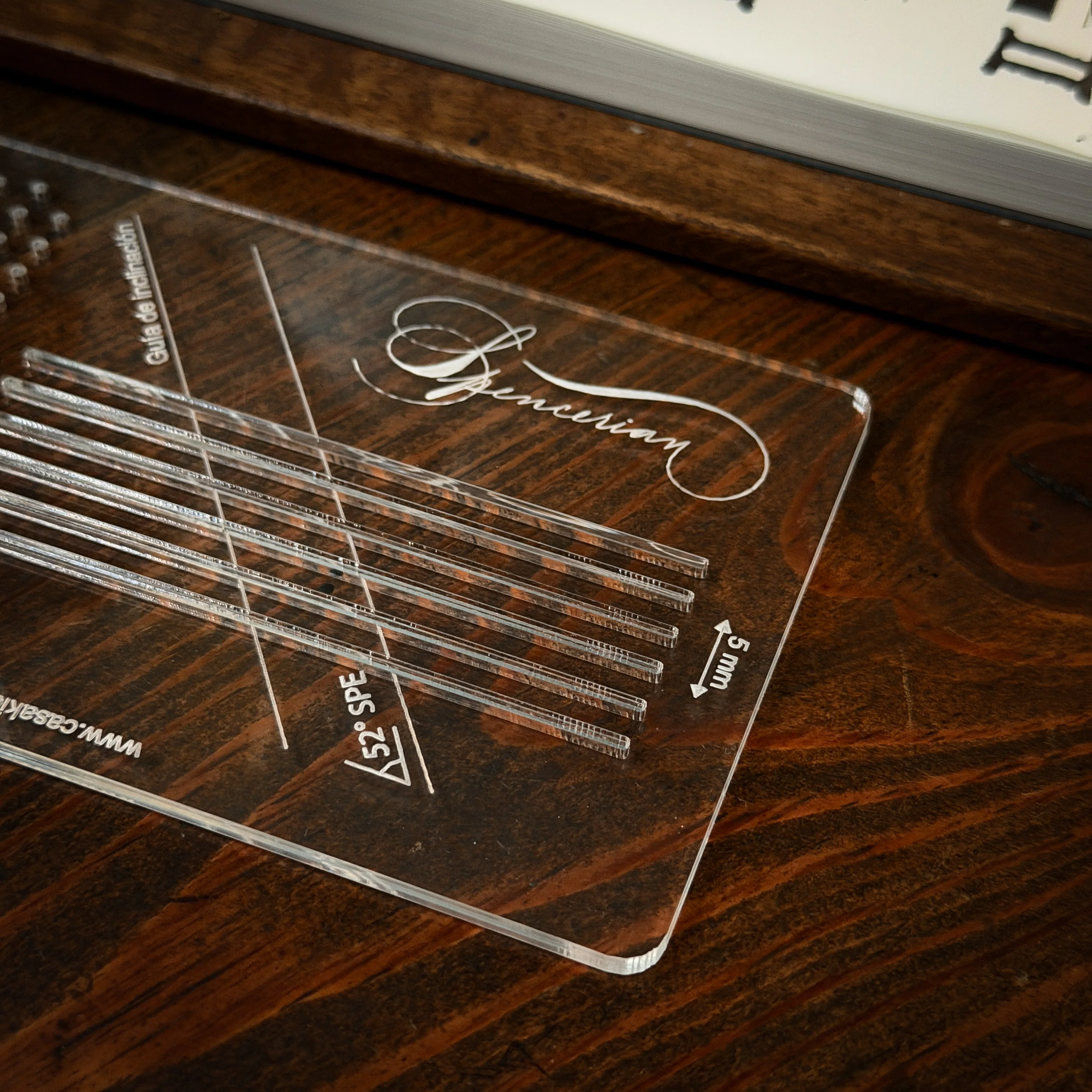 Regleta para caligrafía profesional, diseñada para composiciones de guías o partituras base. Elaborada principalmente para estilos de Spencerian y Ornamental Penmanship. Diseñada por profesionales y expertos en caligrafía para uso personal tanto principiantes como avanzados.