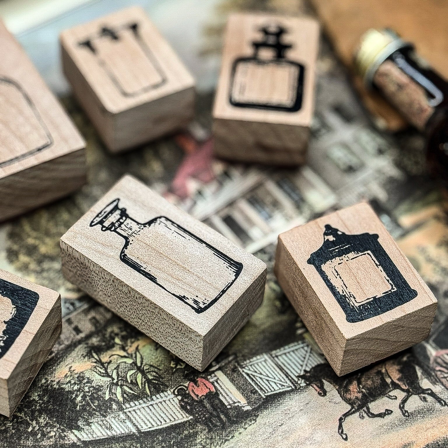 Sellos de caucho rojo montados en madera, compatibles con tintas permanentes, híbridas, gel, etc. Temática de “Boticaria”; este set te permite crear composiciones individuales o en conjunto, ya sea para proyectos de journaling o scrapbooking.